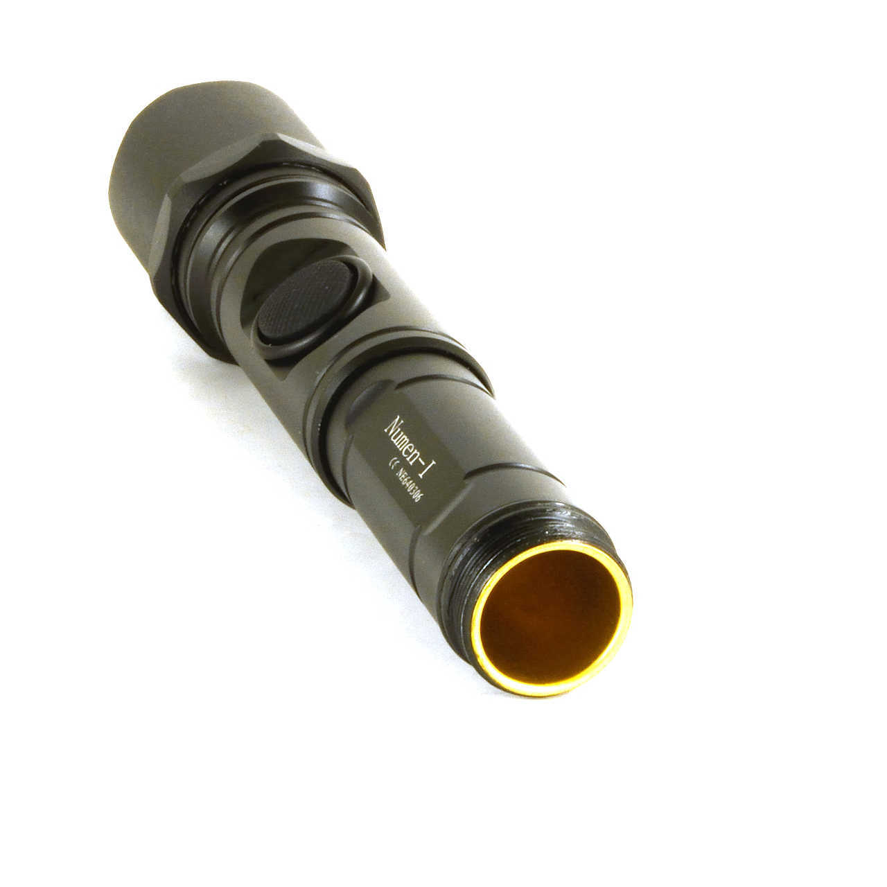 The Numen Ultra Dc, like many Wolf Eyes torches is built around the TTT Thermal Transfer Tube, a brass liner whose job it is to wick damaging heat away from the LED and radiate it out from the body. This ensures a long service life, because if the LED overheats even once it can be permanently damaged and suffer reduced output for the rest of its life. Around the brass TTT is wrapped an aircraft aluminium body which creates a body structure stronger than either material by itself. The whole body is then low temperature (-20o C) Hard Anodized in tactical black.