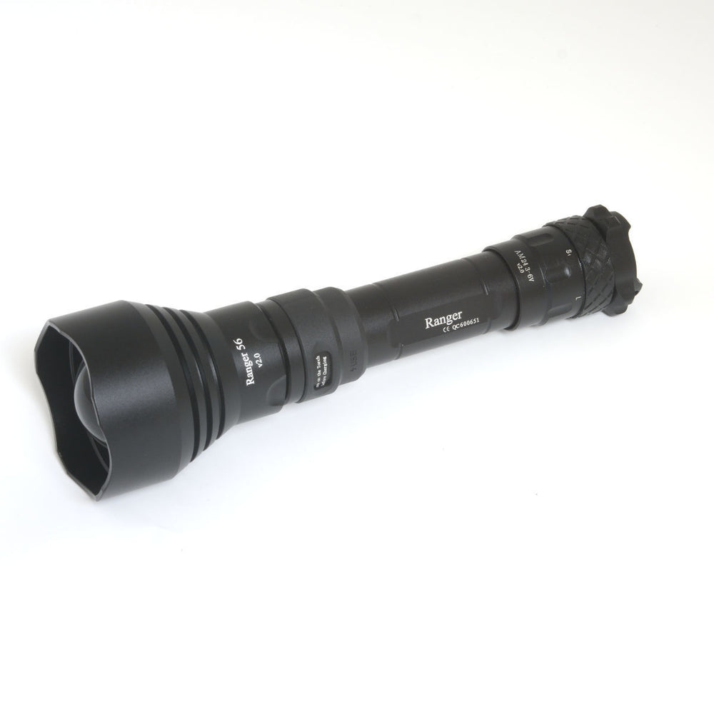 The Ranger 56 IR (Infra Red) LED torch puts out invisible 'black' light in the 850nm range. This is the Infra Red version of our Ranger 56 LED torch, this version is designed for those who own Night Vision gear such as optics, binoculars, goggles or spotting optics. Due to this torch's large head and good distance between IR LED and aspheric lens, the Ranger 56 IR LED torch makes a tremendous IR (Infra Red) illuminator, well suited to those who want to substantially increase the range and clarity of their existing Night Vision scope, binoculars or optics. Many clients have seen a 60% to 100% improvement in range compared to their existing IR Infra Red illuminator.