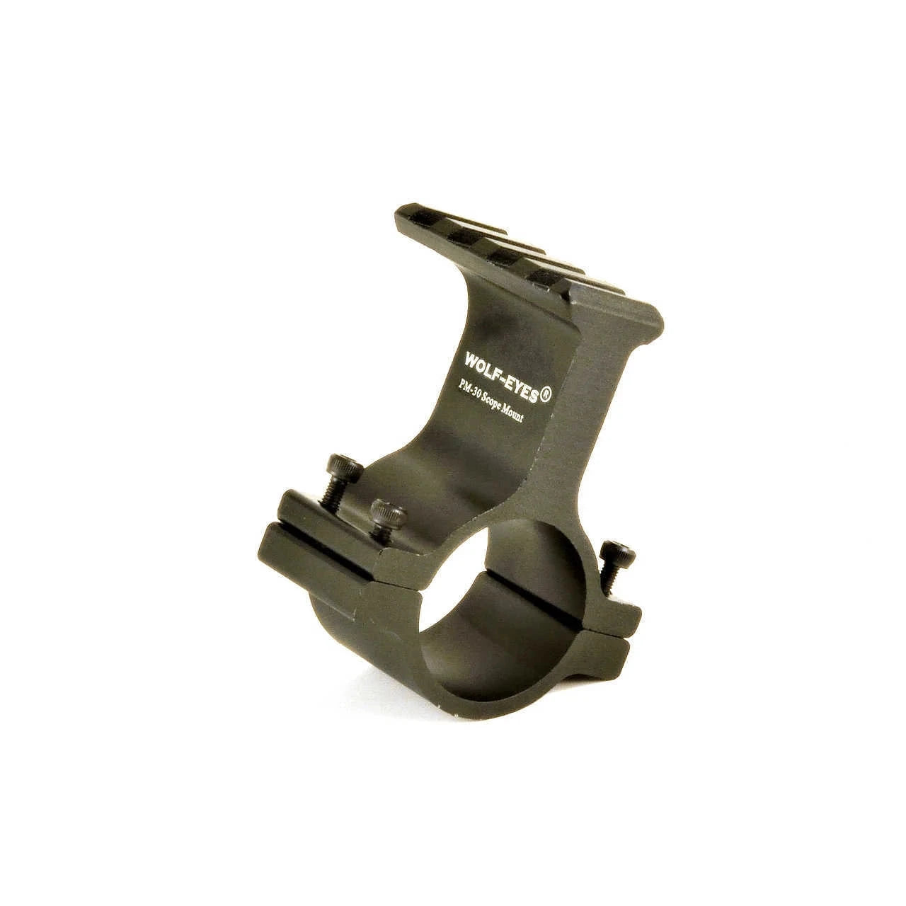 It consists of two parts, the PM30 Scope Mount which adds a picatinny rail to your scope and fits scopes with either a 25.4mm (1") tube or 30mm tube. Two hard rubber bearings are included to allow fitment to both size scope tubes. The scope mount is light and most users leave it on permanently. In many photos you will notice the picatinny rail is at the 12 o'clock position, directly on top of the scope. It is also possible with this mount to mount the picatinny rail at say the 8 o'clock position (4 o'clock if left handed) so that the light is to the side of the scope and you can peer over the top of the scope to scan. The PM30 Scope Mount is designed so it can mount the Wolf Eyes Seal (with its 82mm head) on a 56mm objective size scope without touching.