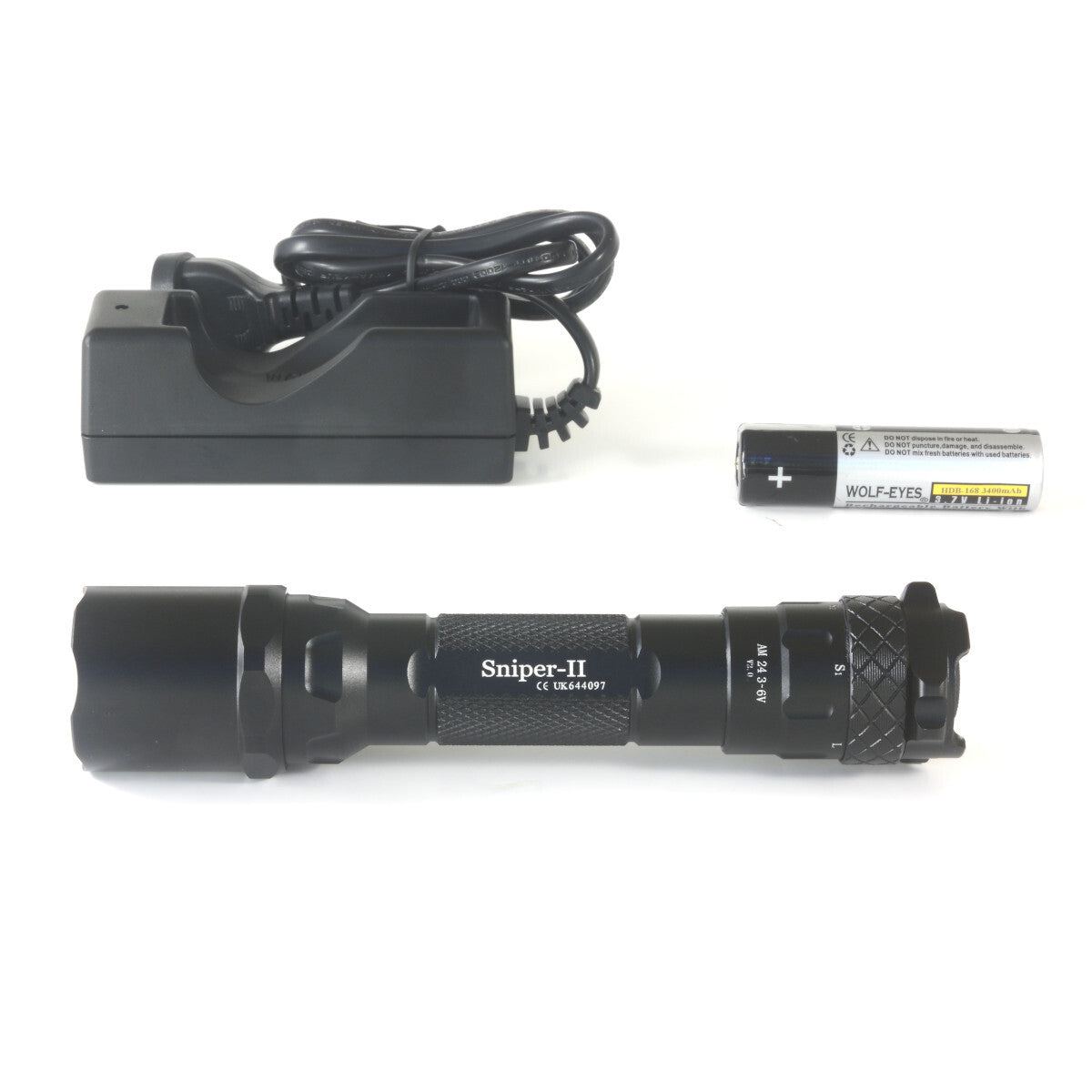 The Sn1per II Pro Ultra uses a LRB168HDB (18650- High Discharge Battery) lithium ion protected battery. This is the same size as the rest of the Wolf Eyes LED torch and headlamp range, meaning you can share this battery between your torches and headlamps. Your other Wolf Eyes batteries are not recommended to use in the Sn1per Pro II 'Ultra', they will work but not let the torch reach maximum output. Due to the lithium ion batteries good output only one is required, meaning we can keep the 25.4 mm (1”) torch body size and modest length. These are protected batteries, meaning there is a computer protection chip built into the battery, which controls charging, discharging and most importantly over discharging. Being rechargeable means low running costs for you. Two disposable CR123A batteries will also power your Sn1per II Pro 'Ultra' LED torch.