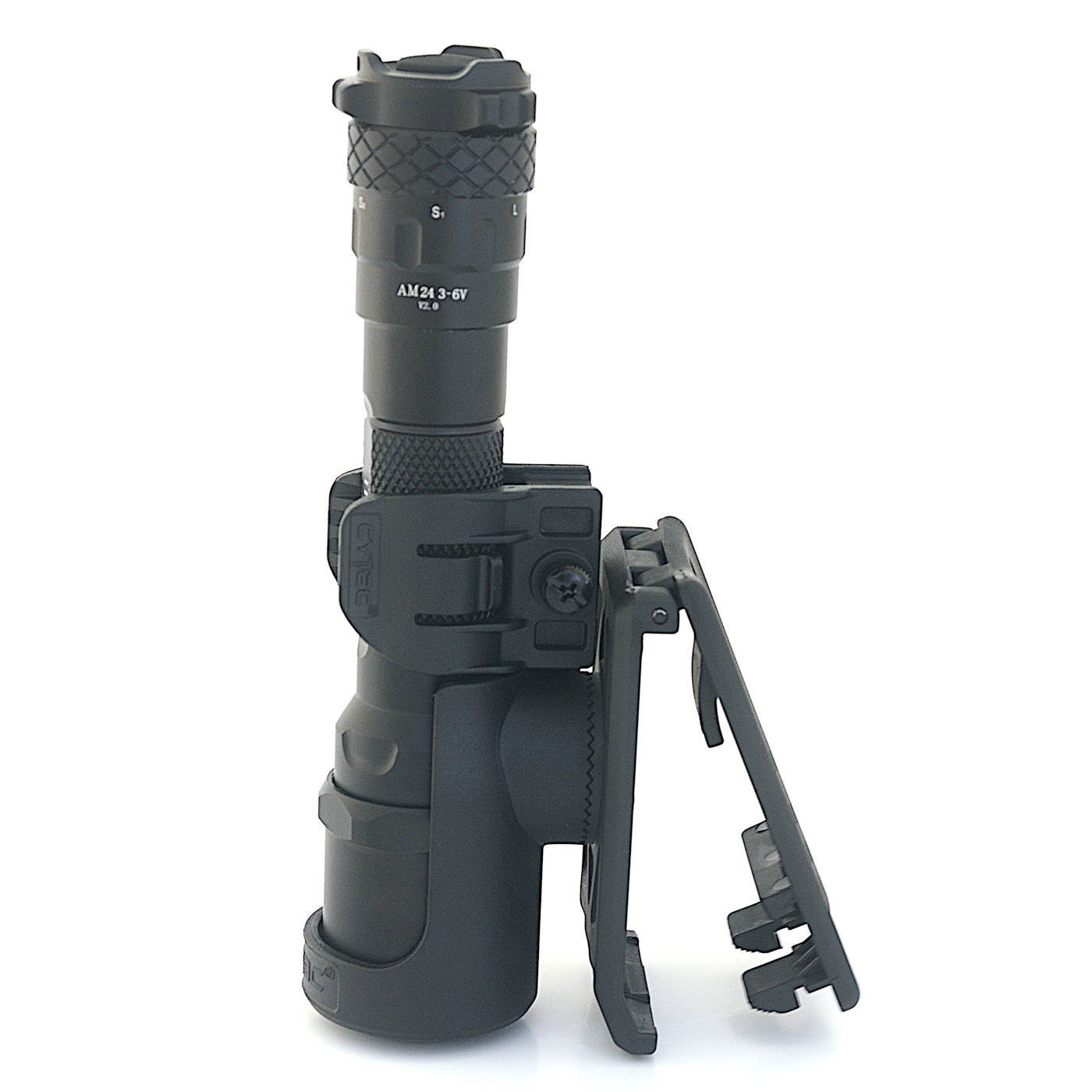 The holster and belt loop are attached by an allen bolt with captive nut and we provide an allen key so you can adjust the torch holster through a full 360 degrees, so you can mount your torch horizontally or even upside down if you prefer! This same allen bolt mounting allows you to change from a belt loop to the optional molle mount if you wish. Again when on the molle mount you can choose through 360 degrees the angle you would like your torch to ride at.